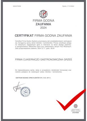 Zapewniamy w pełni fachową obsługę, miłą atmosferę oraz wszelką pomoc przy doborze menu. Imprezy realizowane przez firmę na długo pozostają w pamięci gości, co przekłada się na pozyskiwanie ciągle nowych klientów. Z uwagi na stały wzrost produkcji, poszerzanie produkowanych asortymentów i duży popyt na świadczone usługi gastronomiczne podjęliśmy decyzję o rozbudowie i modernizacji w latach 2009 - 2010 istniejącego zakładu produkcyjnego: rozbudowa hal produkcyjnych wyposażonych w nowoczesne parki maszynowe z automatyzacją podstawowych procesów technologicznych, nowocześnie wyposażony dom weselny do 250 osób do organizacji imprez okolicznościowych. Firma prowadzi również działalność charytatywną zaopatrując nieodpłatnie w słodkości wiele potrzebujących instytucji i organizacji.